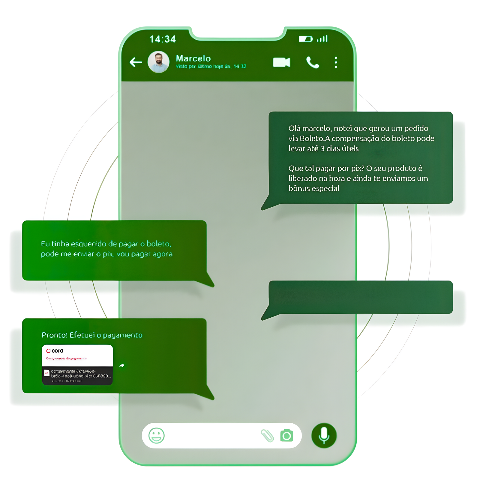 Mas com o Smartbot a história é outra, seu cliente gerou um boleto e na mesma hora nosso chatbot entra em contato com seu cliente no whatsapp transformando seu boleto NÃO PAGO em PIX PAGO e o melhor de maneira 100% automatizada e humanizada, 7 em cada 10 boletos serão convertidos em Pix pagos.